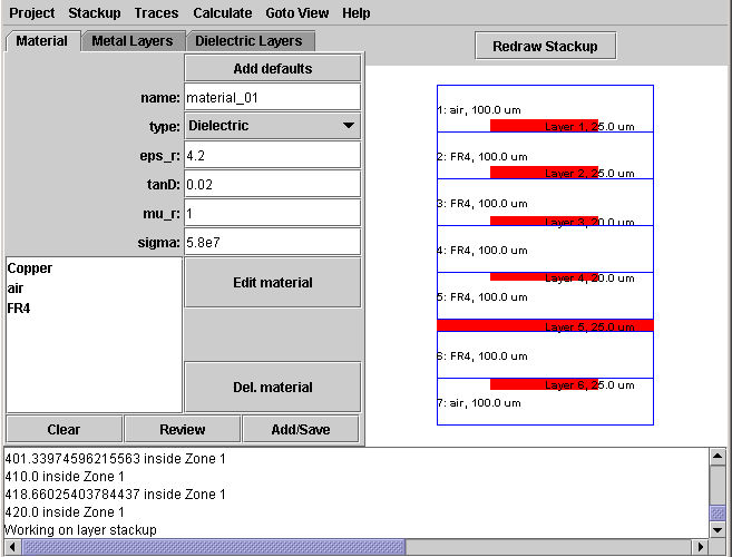 Click the "Add defaults" button causes the tool to load the pre-defined materials: air, FR4, and copper.