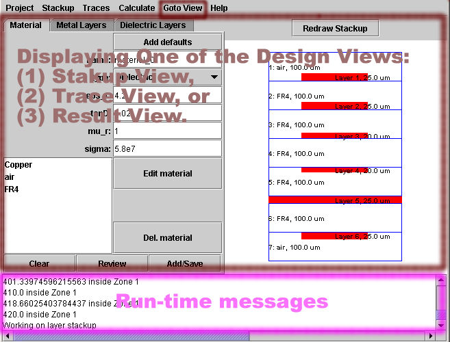 The user interface is carefully designed to suit the typical flow a board layout engineer would go through. The top-level graphical user interface (GUI) is composed of a menu bar, a design view area, and a message area. The menu bar contains all menu items associated with all the features this tool offers. The message area holds the messages generated during various courses of action. The design viewe area is the most important for user to understand.