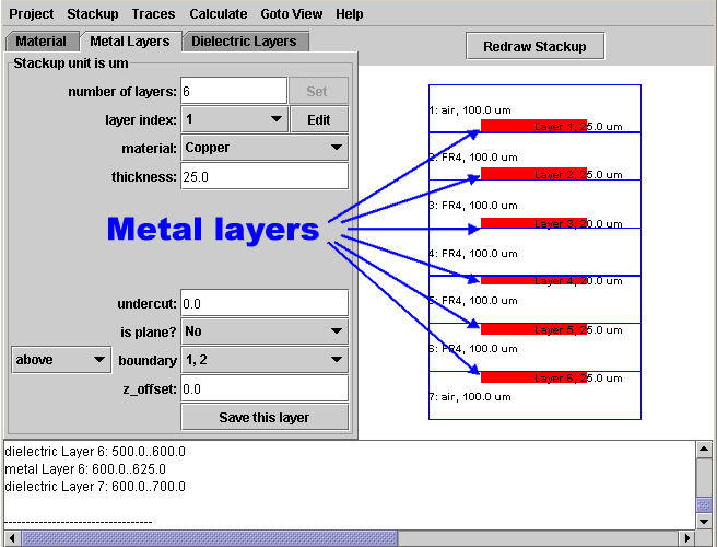 When the actual board consists many metal layers, say 10 or more, user is advised to break the stackup into several regions with each region composed of manageble number of metal layers. The most important decision is to set the number of metal layers. Upon clicking the "Set" button, definition of metal layers are automatically generated with initial settings. The attributes in the upper half of the pane are obvious, while the attributes in the lower half are explained below: