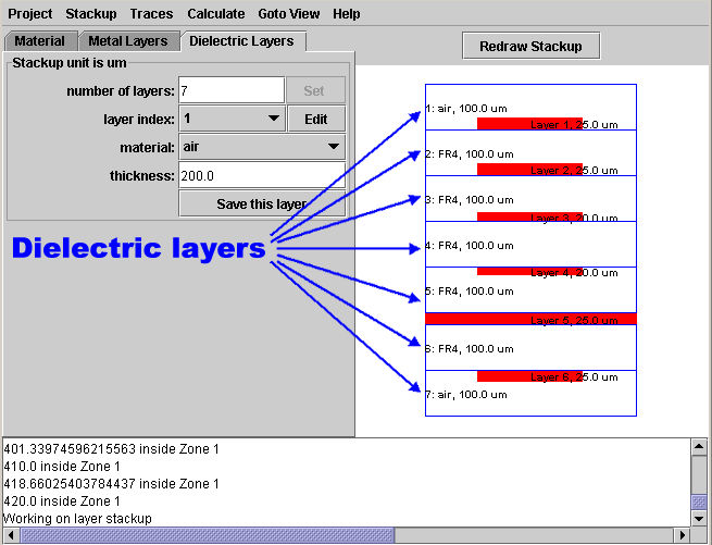 It is recommended to always specify the number of dielectric layers to (<number of metal layers>+1). This will assure consistency with the automatic settings of the boundary choice in the "Metal Layer" pane. For an actual board, there are (<number of metal layers>-1) dielectric layers sandwiched between the metal layers. Two more dielectric layers are the solder mask (passivation) layers above/below the top/bottom metal layers. If there is no solder mask, user can simply specify the topmost and bottommost dielectric layer to be made of "air".