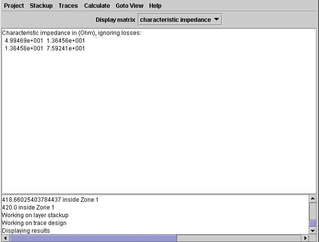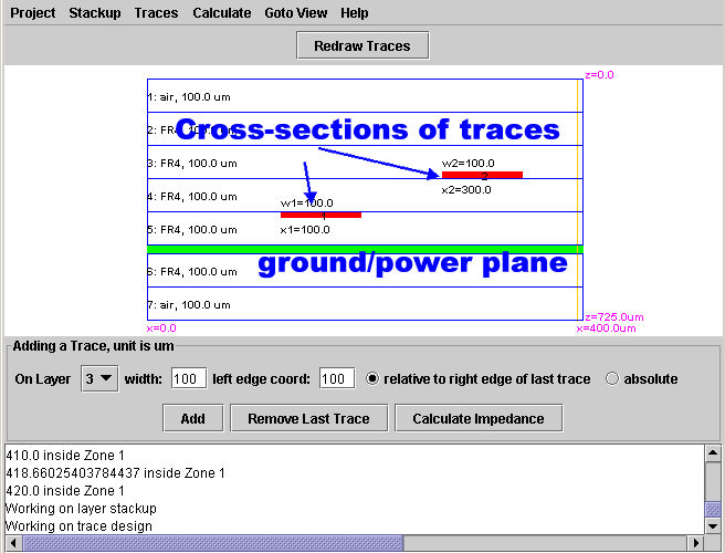 The position of trace matters only when there are more than one traces being analyzed. The position of a trace is determined by sepcifying the "x-" coordinate of the left edge. This "x-" coordinate can either be specified in absolute value, or in relative displacement with respect to the right edge of the last defined trace. The radio button "absolute" and "relative" can be chosen. Clicking the "Add" button cause a new trace to be entered. Once a trace is entered, it can not be modified, however, it can be removed by using the "Remove Last Trace" button. You may also decide to re-define all traces by using the menu "Traces::New Traces" to start from scratch. As mentioned earlier, this tool allows different units for "z-" and "x-" coordinates. The "x-" coordinate unit can be selected using menu "Traces::Set X Unit". However, after switching from one unit to another, all values will remain unchanged. The user is resposible to manually adjust the values due to conversion between units. There are two colors used in the "Trace View" - Red for the signal traces, and Green for the power/ground planes as well as for the grounded traces. Any metal layer associated with "Yes" in the "is plane?" in the "Metal Layers" panel is recognized as a power/ground plane and colored green automatically. Each trace is given an index starting from "1" and displayed on the canvas. Traces can be grounded by using the menu "Traces::Set Grounding Traces" to enter indices for traces to be grounded. Conversely, menu "Traces::No Grounding Traces" reset all trace to be signal traces. The effects of all grounding structures are automatically accounted for in impedance calculations. The eventual results apply to only the signal traces. The usage of the trace-grounding option is very powerful. In particular, the impedance of a co-planar structure with or without ground planes can be easily solved by first defining a group of (Ns+Ng) traces then set Ng of them being grounded, the system contains only Ns signal conductors.
